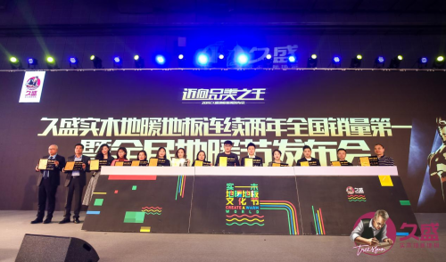 2019年3月27日,久盛地板于上海虹桥国家会展中心举办“迈向品类之王——2019久盛地板新闻发布会”,三大品牌消息全国首发:联合全球权威认证机构欧睿国际发布“久盛实木地暖地板连续两年全国销量第一”、联合中国林业科学研究院木材工业研究所共同发布 “《地采暖用实木地板》全国首发仪式”以及“久盛实木地暖地板文化节温暖启幕”。