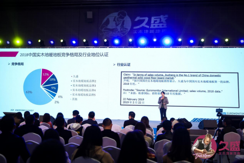 全球权威认证机构欧睿国际大中华区高级总监穆愔女士现场宣布:久盛实木地暖地板2018年全国销量稳居第一。这也是久盛继2017年全国销量第一后再次蝉联该品类销量冠军,意味着久盛在新品类的推广中又有了一个全新的进程,已经成为该品类名副其实的领导者,也意味着该领域未来发展的空间无限。