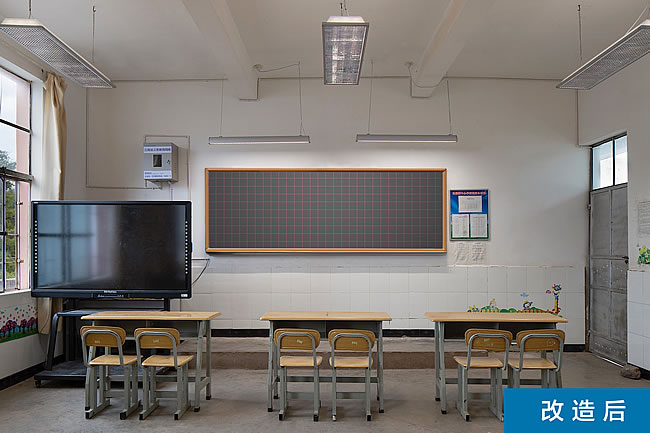在此次志愿活动中,欧普还发现虽然学校校舍相对完善但室内照明情况并不理想,为了呵护孩子们的眼睛,给他们创造一个健康舒适的用光环境,欧普特别提供了专业健康教室照明整体解决方案,使用从专业的健康光学角度,研发设计出的LED护眼黑板灯和LED护眼教室灯,替换老旧灯具。避免孩子受到高眩光、蓝光、可视频闪等危害,让整体光环境得以最佳的展现。