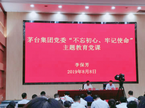 8月8日,茅台集团党委书记、董事长李保芳在茅台会议中心为集团公司各直属党委、党支部负责人,政工群团部门管理人员和主题教育领导小组办公室有关工作人员上了一堂“不忘初心、牢记使命”主题教育专题党课。茅台集团党委副书记王焱主持党课,贵州省委第十八巡回指导组组员李亚平、何剑到场指导。
