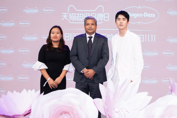 (左起:阿里本地生活服务公司副总裁筱霏、哈根达斯所属通用磨坊公司中国区董事总经理Manish Shukla、哈根达斯品牌代言人刘昊然)