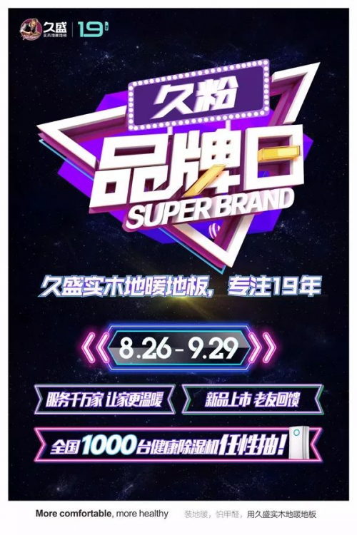 “久粉品牌日”,是久盛地板藉19岁成人礼之机,满载着对久粉们的爱意,特别制定以“服务千万家,让爱更温暖”为主题,为实现品牌与粉丝的深度联结的粉丝狂欢节,是久盛地板继爱木周、全民地暖节、潮品季等大型品促盛会后,又一个全新倾情打造久盛IP。