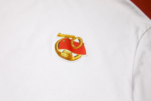 本次70周年限定系列T恤,设计风格与标志徽完美结合,前面印花直接采用了标志徽图案,背后经典LOGO色调以契合70周年庆典的烫金和红色为主,边框辅以长城设计,整体的设计偏向现代潮流风格,最大限度的呈现新东方美学调性,是当代中国青年先锋精神和爱国情怀的融合。