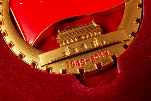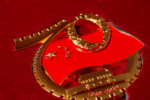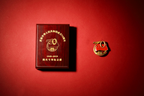 庆祝中华人民共和国成立70周年庆典活动中,阅兵方队官兵佩戴“庆祝中华人民共和国成立70周年阅兵专用标志徽”。徽章里的元素有国旗、天安门、华表、长城、祥云,象征着全国人民一心向党,中华人民共和国国旗和天安门、华表寓意国庆大典;“7”字形金色长城与“0”字形金色祥云组成“70”字样,寓意中国人民共和国成立70周年;长城寓意人民军队始终如钢铁长城,保卫人民共和国固若金汤、国运绵延;长城如昂首的巨龙,寓意华夏腾飞,民族复兴;开口的“0”形祥云寓意中华文明开放共融、海纳百川、文明互鉴;天安门、华表和长城上镌刻的“1949-2019”字样,寓意中华人民共和国1949年10月1日成立和70年后的庆典,都有天安门和华表的庄严见证。