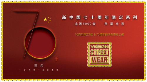 新中国成立70周年之际,知名滑板街头品牌VisionStreetWear携手“70周年阅兵纪念徽章”推出新中国成立70周年阅兵纪念限定系列。每款包含一件根据“70周年阅兵纪念徽章”特别设计的T恤及一枚参加大阅兵方队官兵佩戴的同款“70周年阅兵纪念徽章”。该限定系列于10月1日正式上架发售。此限定系列旨在向中华人民共和国成立70周年献礼,同时也表达VisionStreetWear作为一个深受青年人喜爱的滑板街头品牌,对在各领域为祖国奉献的有志青年们的致敬。