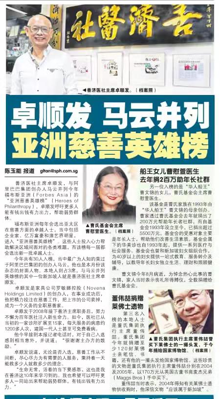 2019福布斯亚洲(Forbes Asia)的“亚洲慈善英雄榜”(Heroes of Philanthropy)善济医社主席卓順发太平紳士与阿里巴巴集团创办人马云并列入榜。