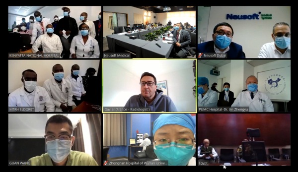 22日,北京时间15点,肯尼亚时间10点,在内罗毕的肯雅塔国立医院(Kenyatta National Hospital)及埃尔多雷特的莫伊教学与转诊医院(Moi Teaching Referral Hospital),由全球在医疗影像高端设备领域知名的中国企业东软医疗提供的新冠肺炎人工智能辅助筛查系统“火眼AI”、影像云系统及CT设备,正式进行当地确诊的新冠肺炎病情诊断。同时,远程会诊平台上不仅有肯尼亚卫生内阁部长穆塔希·卡格威及医院的医疗专家,东软医疗沈阳总部与法国的临床应用专家,还有为肯尼亚提供远程义诊的中华放射学会主任委员、中国医师协会放射医师分会候任会长、北京协和医院放射科主任金征宇教授和其团队,以及来自武汉的医疗专家。相隔万里的多方视频通话,为了一个“人类共同命运体”的目标,国内医疗力量正在竭尽所能,帮助肯尼亚及其他非洲国家快速掌握应对新冠疫情的诊疗办法及治理能力,深化中非多年构建的“一带一路”情谊,共同进步、共同抗疫。