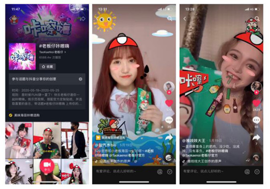 截至5月底,Tao Kae Noi#老板仔咔嚓嗨挑战赛播放量近6600万,参与视频总量1.4万多条,泰国“国民海苔”Tao Kae Noi老板仔海苔在抖音上进行了一次短视频营销的成功“试水”。
