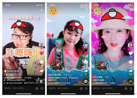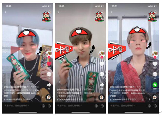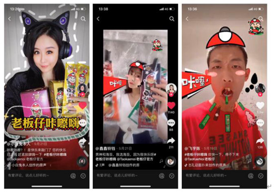 本次#老板仔咔嚓嗨抖音挑战赛中,参赛者通过使用Tao Kae Noi老板仔品牌定制贴纸拍摄短频,记录和分享生活中快乐的瞬间,萌趣横生的定制贴纸恰如其分地传递着“快乐老板仔,美味又自在”的品牌主张。张嘴吃Tao Kae Noi老板仔各式海苔,即可吐出Tao Kae Noi快乐因子,简单魔性的互动贴纸吸引了抖音上各类人群的热情参与,天真烂漫的孩子、花样青春少女、搞笑段子手、爱笑的阿姨们都加入了Tao Kae Noi老板仔的快乐挑战。