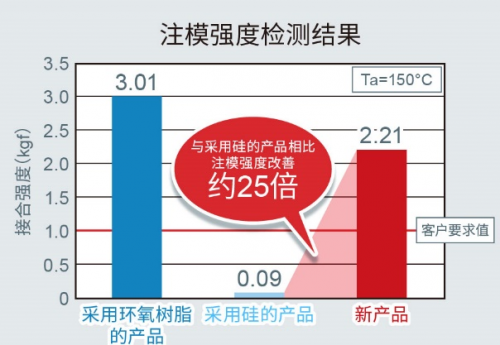 在直接影响贴装性的注模强度方面,通过采用新树脂,使高温条件(Ta=150℃)下的注模强度达到了硅树脂产品的25倍左右。这使得安装时不容易发生问题,从而可实现优异的贴装性。