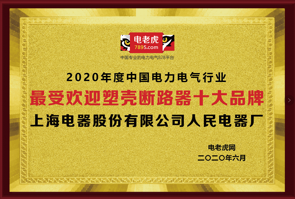 由电老虎网主办的2020年中国电力电气“最受欢迎塑壳断路器十大品牌”评选结果已于6月6日正式揭晓。经过半个多月的激烈角逐,超过百万人次参与,上海电器股份有限公司人民电器厂凭借超强的综合实力、市场规模以及品牌影响力等荣获2020年度中国电力电气“最受欢迎塑壳断路器十大品牌”。