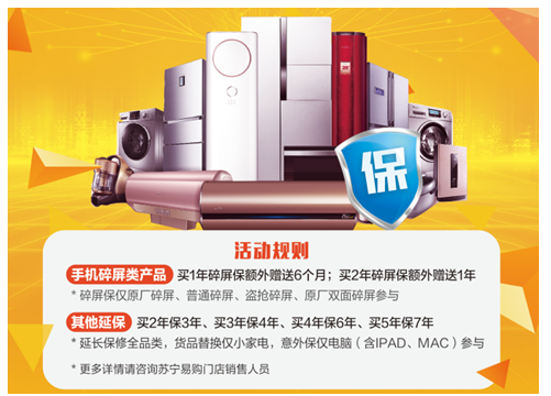 在7月16日至7月20日、7月30日至8月3日活动期间,凡是在苏宁线下门店购买2、3年期延保(包括事后延保),可享受在原有购买年限基础上免费赠送一年延长保修期的超值服务。购买4、5年期延保(包括事后延保),可享受在原有购买年限基础上免费赠送两年延长保修期的超值服务,多买多送,多买多保障。
