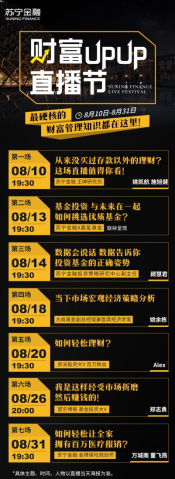 本次直播节将持续三周。感兴趣的用户可以通过登陆苏宁金融APP“财富”页,或关注苏宁金融微信公众号,点击底部菜单中的“财富直播”,即可获取观看链接。