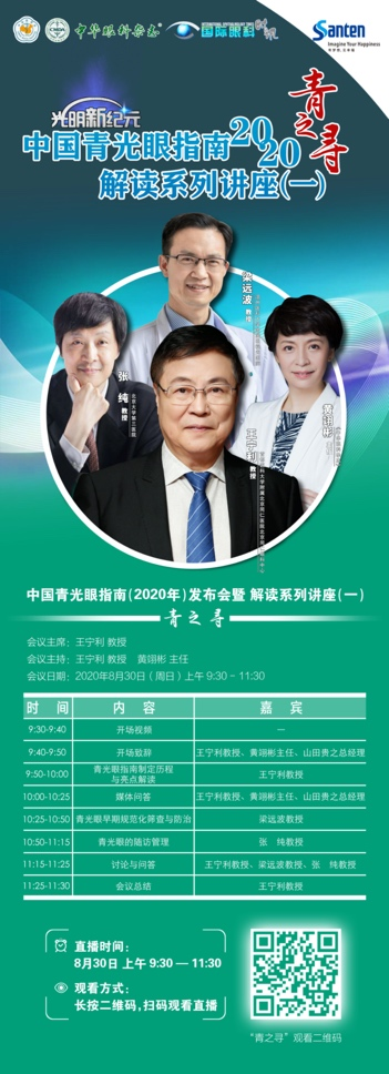 2020年8月30日,“中国青光眼指南(2020)发布会暨中国青光眼指南(2020)解读系列讲座”首场会议于线上正式举行。首都医科大学附属北京同仁医院北京同仁眼科中心的王宁利教授、中华医学会《中华眼科杂志》主编黄翊彬主任、北京大学第三医院眼科的张纯教授、温州医科大学附属眼视光医院杭州院区的梁远波教授,以及参天制药中国区总裁山田贵之先生等出席本次会议。