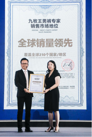 九牧王31年来专注男裤领域,从12台缝纫机起家到男裤累计销售1亿条⑤,九牧王以“专业好品质”的男裤产品获得广大消费者认可与支持。此次荣获“全球销量领先的男裤专家”销售市场地位,是以九牧王为代表的民族自主品牌站上世界舞台的瞬间,也是中国创造赢得世界目光的时刻。对此中国服装协会会长陈大鹏先生表示:“九牧王作为中国服装行业最优秀的品牌代表,获得‘全球销量领先的男裤专家’的认可,标志着九牧王已成为具备国际影响力的中国服装品牌,对于促进中国服装行业的良性有序发展起到了举足轻重的作用,同时也将代表中国服装企业走向世界、冲击世界之巅。”