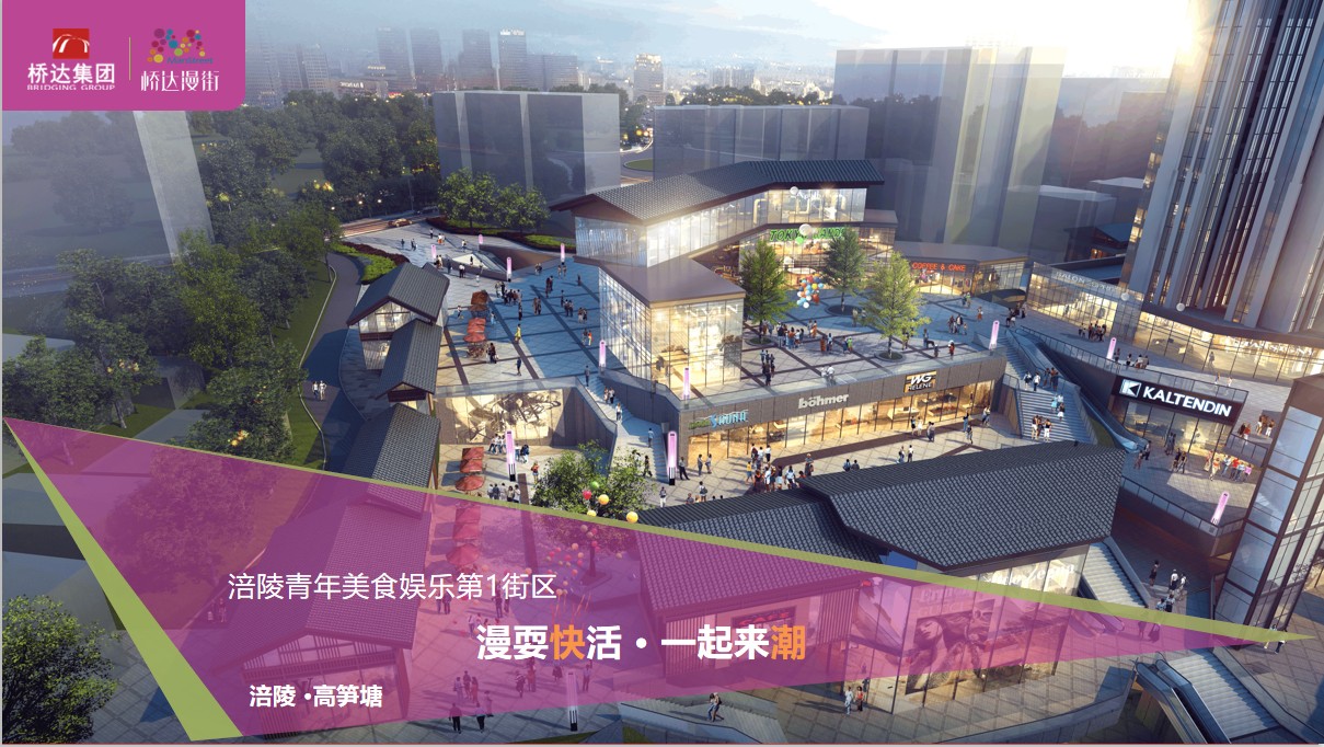 涪陵桥达漫街,占据高笋塘商圈核心位置C位,商业体量达5万平方米,以“漫耍快活,一起来潮”为定位,精心打造多层退台式坡屋顶建筑。巧妙采用新中式仿古风格,还原涪陵滨江“梯街”风貌。新潮文艺格调装修,炫酷夜生活消费体验。涪陵桥达漫街,以更全面的美食娱乐休闲业态,鼎力打造涪陵人的夜生活新主场、吃喝玩乐欢娱新中心、年轻时尚人群消遣圣地。