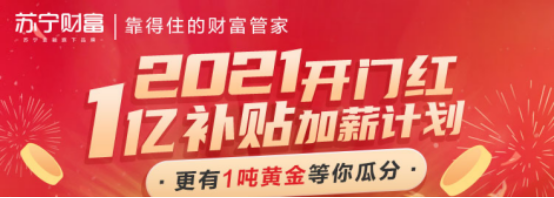 为了给大家开个新年好彩头,苏宁金融旗下苏宁财富开展“2021开门红——1亿补贴加薪计划”,通过做任务赚红包,总共1吨黄金等您瓜分,让大家在新年财运连连!