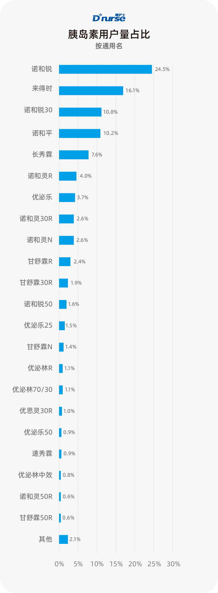 速效胰岛素由2016年报告的24.8%(排名第三),增长至2020年的30%,上升趋势明显(上升了5.2%)。