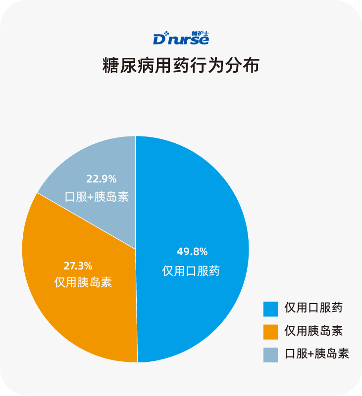 从糖尿病用户用药习惯数据可以看出,近五成糖尿病用户只使用口服药,22.9%的患者采用胰岛素和口服药联合治疗。