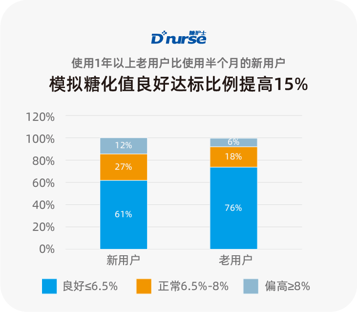 通过模拟糖化数据分析,使用1年以上的老用户比使用半个月的新用户,模拟糖化良好达标比例高出15%。(病程较短、预期寿命较长、无并发症、未合并心血管疾病的 2 型糖尿病患者,在不增加低血糖风险的前提下,应采纳更严格的糖化血红蛋白控制目标,甚或尽可能接近正常[2],因此我们将≤6.5%作为控制良好的标准)