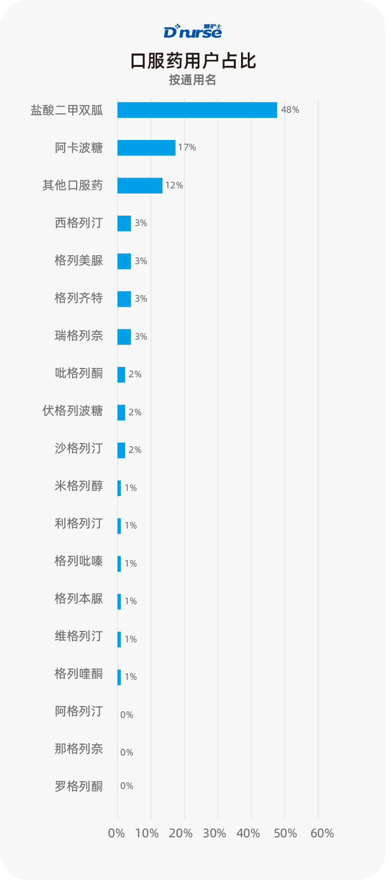 盐酸二甲双胍、阿卡波糖是糖尿病患者选择最多的口服用药,占比达65%,其中盐酸二甲双胍占比达到48%。