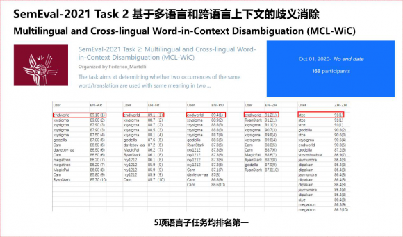 在"基于多语言和跨语言上下文的歧义消除"赛事中,平安人寿AI团队提出了自监督分类算法SCASD,最终夺得一项多语言任务冠军及四项跨语言子任务冠军。