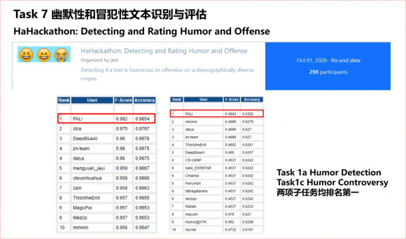 在"幽默性和冒犯性文本识别与评估"赛事中,平安人寿AI团队研发了基于多维注意力对抗样本的交互多任务训练模型MDAA,在Humor Detection和Humor Controversy两项子任务中分别取得98.2%和98.54%的优异成绩夺得榜首。