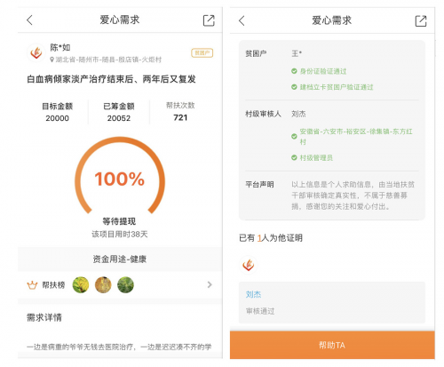 精准发布——贫困户身份经系统验证后可在平台发布医疗、教育、民生、住房等求助需求,接受来自全国各地爱心人士的帮助;