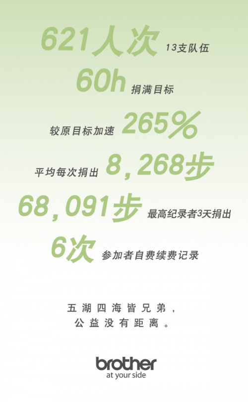 活动一经上线,就引发暴走热潮。员工、员工亲友、合作伙伴、热心网友……纷纷加入兄弟(中国)的捐步队伍中。活动总计得到621人次捐步支持。原预计维持1周左右的活动,仅用60小时,兄弟(中国)就已完成捐步目标。更有参加者自费为兄弟(中国)的捐步活动续费,续费次数达6次。