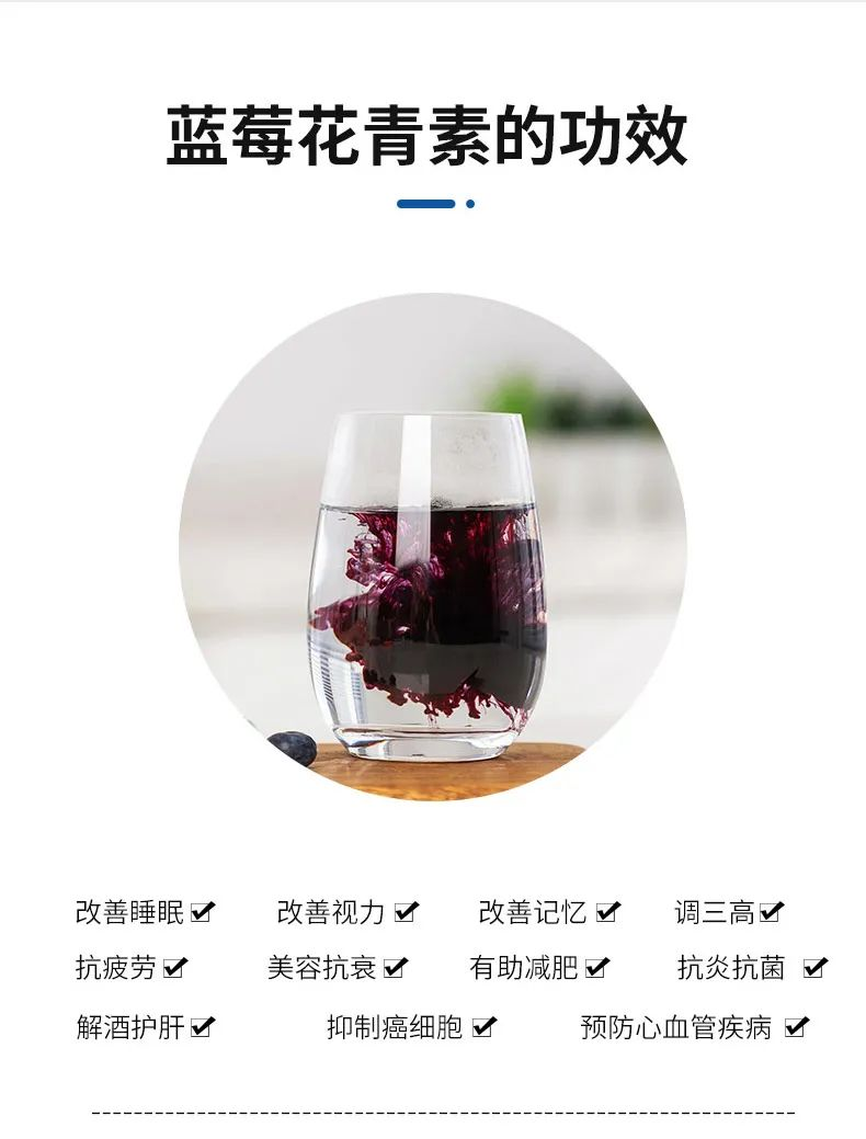 “蓝美1号”花青素萃取自国家林木良种“蓝美1号”。有完整的15种花色苷,纯度达40%以上,超越一般植物花青素的生理活性和功能。这样高纯度的天然蓝莓花青素,对预防癌症、抗三高、抗炎症、抗衰老和神经退行性疾病等,具有神奇的功效。