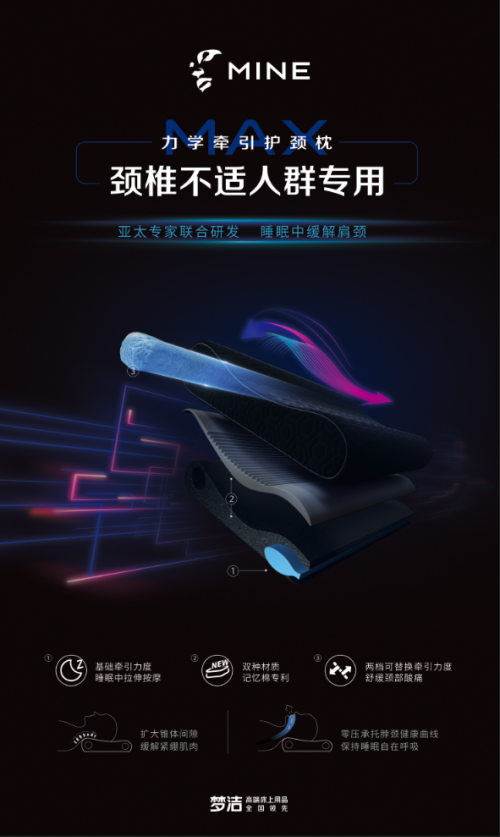 手机、电脑日渐成为人们最主要的消遣方式,“低头族”的增多让很多人遭遇肩颈劳损和酸痛的烦恼,睡眠不好、肩颈疼痛等让很多人苦不堪言。根据《英国医学杂志》发表的一项研究显示,全球范围内肩颈疼痛的人数,从1990年的1.643亿增加到2017年的2.887亿,肩颈问题已经成为了全球人共同的“负担”。为了解决颈椎不适人群烦恼,梦洁联合亚太整脊专家,重磅发布高端护颈枕——力学牵引护颈枕Max,采用双重材质专利、三重可替换牵引硬度等行业领先设计,颈椎不适人群专用,医用级缓解肩颈。一经亮相,惊艳业内。