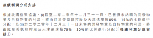 根据远洋公告,截止2020年12月31日,红星地产已售但未结转的开发物业及自持物业的利润,将由红星美凯龙控股与天津远璞按照85%:15%的比例进行分配;截止2020年12月31日,未售的开发物业及自持物业的利润,将由红星美凯龙控股和天津远璞按70%:30%的比例进行分配。