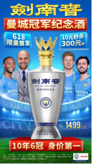 为庆贺曼彻斯特城足球俱乐部获得2021-2022赛季英格兰足球超级联赛冠军,同时纪念曼城“10年6冠,身价第一”的伟大成就(11-12英超赛季至21-22英超赛季),剑南春和曼彻斯特城足球俱乐部官方联合推出高端限量臻品——曼城冠军纪念酒。