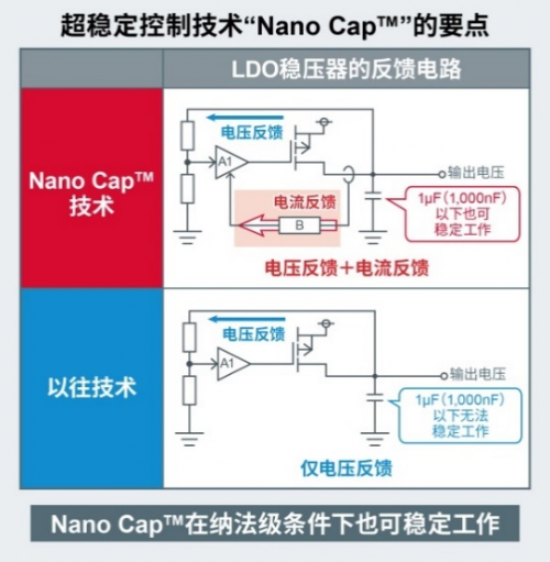 为了解决这些课题,ROHM于2020年确立了用于电源IC的超稳定控制技术“Nano Cap”。此次的新产品通过搭载Nano Cap技术,实现了在输出电容器容量非常小的条件下也能稳定工作的LDO稳压器。