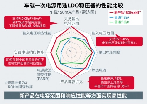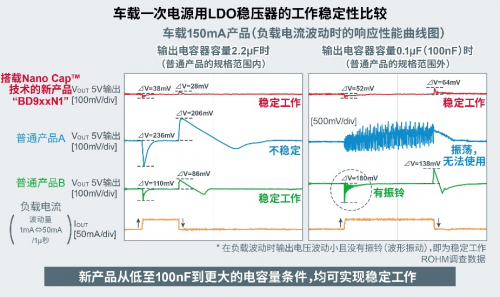 新产品是搭载了ROHM自有的超稳定控制技术“Nano Cap”的新型车载LDO稳压器系列,支持低至100nF(纳法:10的负九次方)的输出电容量,不到普通产品1/10,而且,在输入电压和负载电流*2波动的情况下,也能实现应用产品所要求的稳定工作(输出电压波动100mV以内:负载电流波动1mA⇔50mA/1µ秒时)。新产品支持超宽范围的输出电容量,不仅适用于普通的数μF的小型MLCC(多层陶瓷电容器)和大容量的电解电容器,也适用于以往实际应用中很难稳定工作的1μF以下的0603尺寸超小型MLCC,因此,不仅有助于元器件和电路板的小型化,还可以在更广泛的电容器条件下使用,有助于减少设计工时。