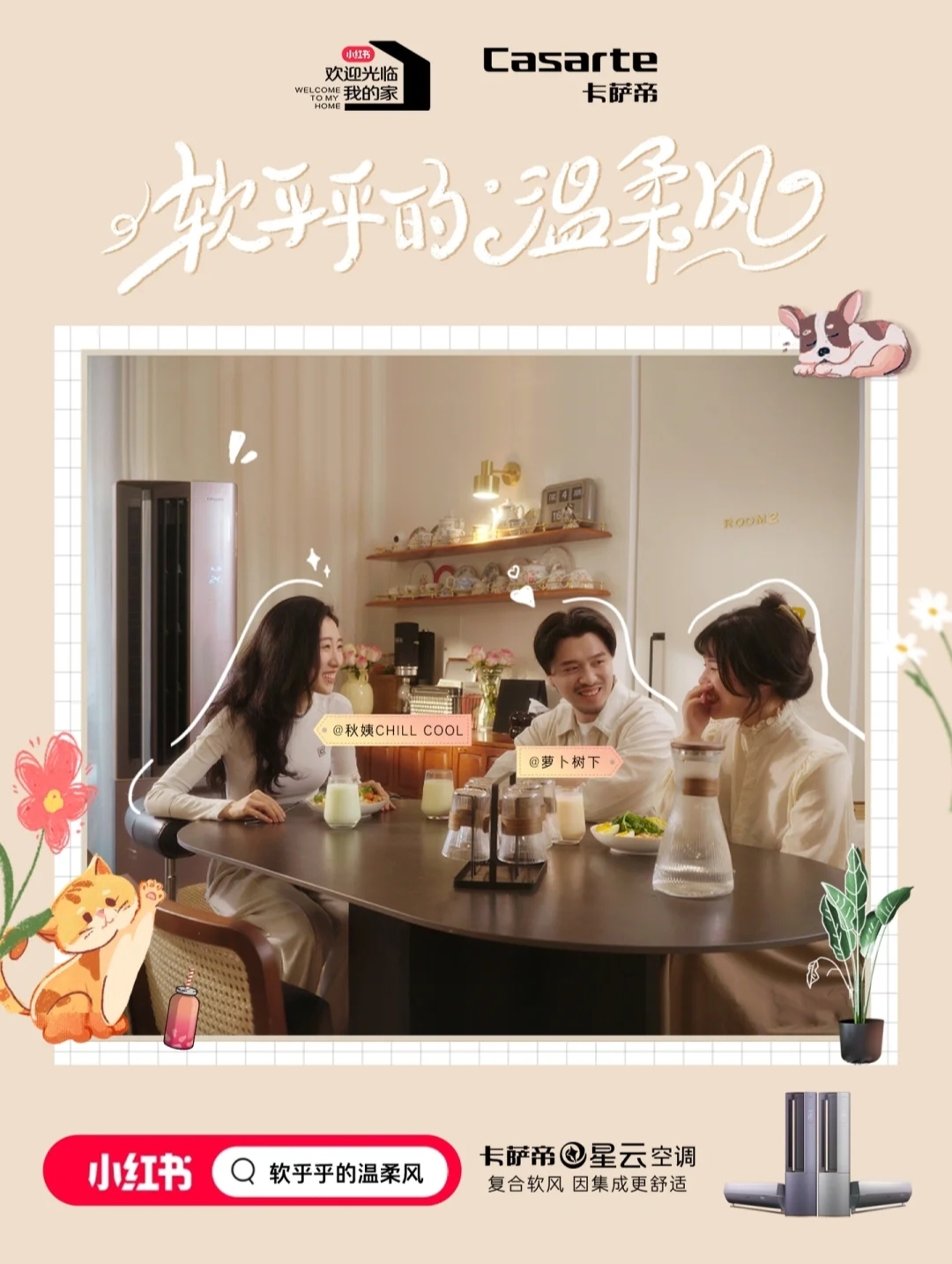 本次「软乎乎的温柔风」活动以博主@萝卜树下 和@秋姨ChillCool 的两支vlog开启,双重视角多维度阐述卡萨帝星云空调产品卖点,邀请2亿小红薯发布灵感笔记。视频中@秋姨ChillCool 受邀做客@萝卜树下 的家,暖色调慢节奏的视频带用户感受他们的理想生活,真实地分享了卡萨帝星云空调的使用感受。