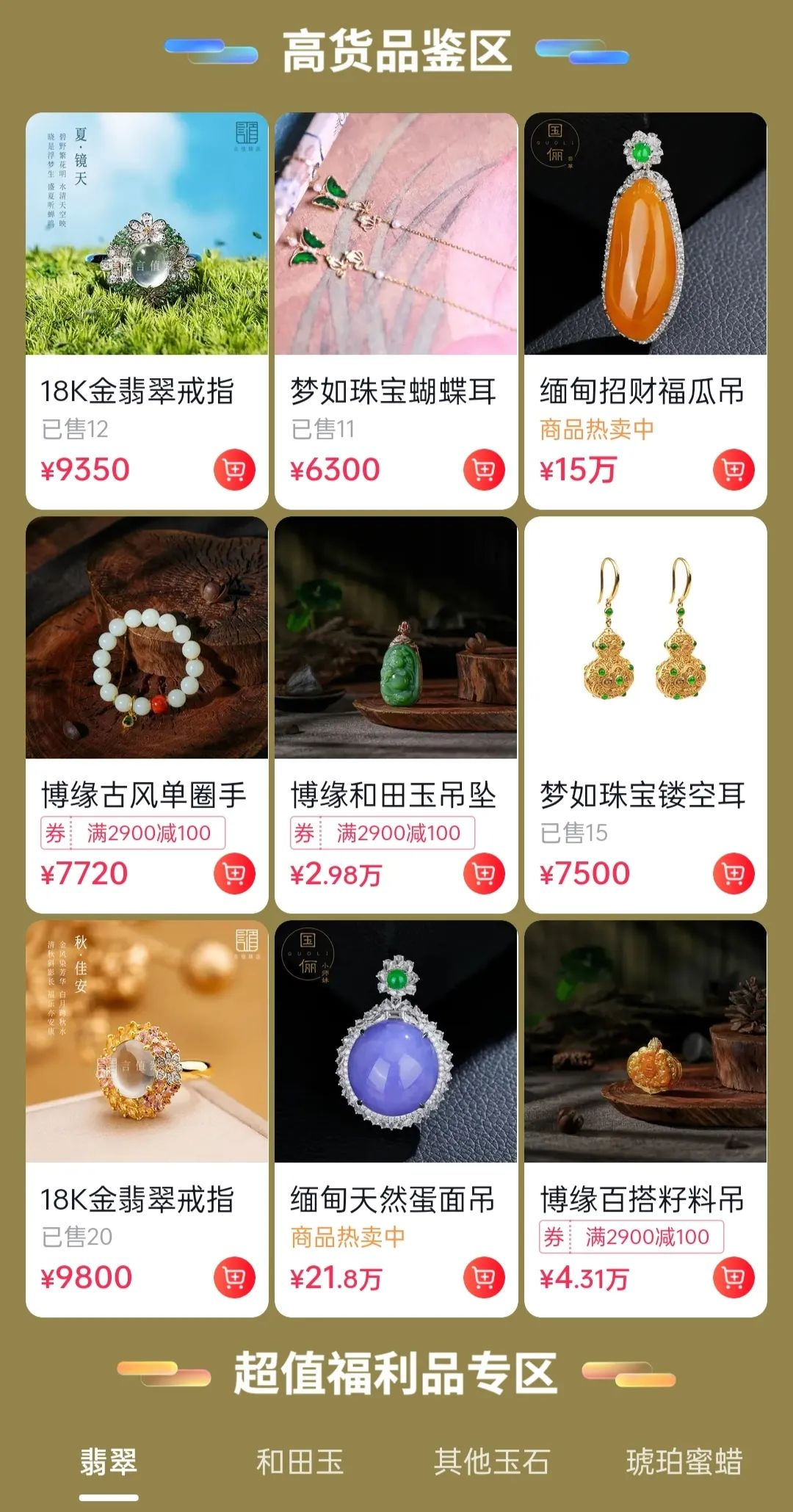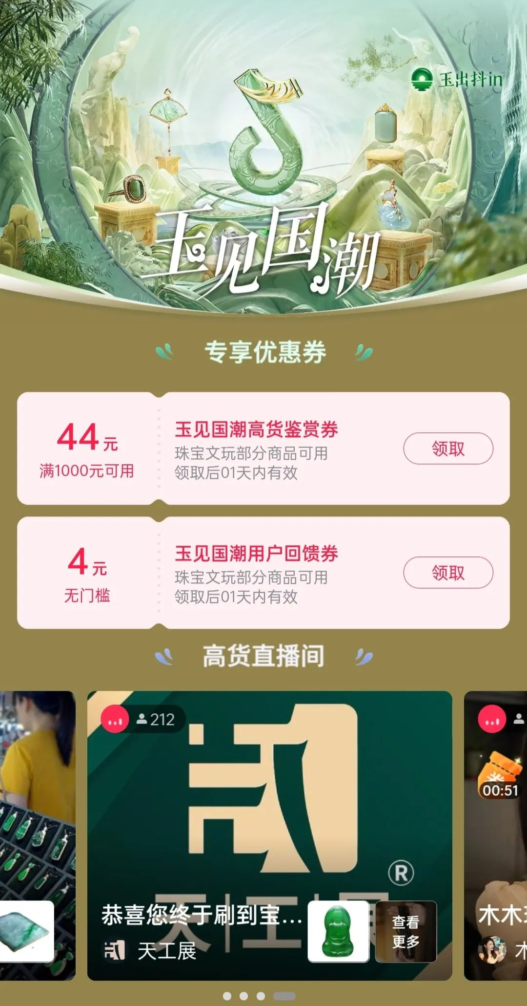 三方数据显示,有62%的受访网民偏好从电商平台消费国潮商品。在电商消费场景中,用户不仅会被优质的科普、售卖玉石的直播内容所吸引,同时也会在“边逛边买”的货架场景中,被福利活动、优价好物所吸引。