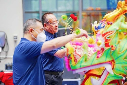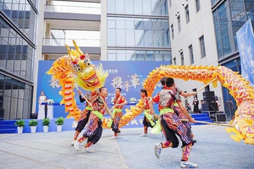 承载着来宾的祝福、同仁的期许,玲珑集团总裁王琳、喜蕈生物总经理迟少波共同开启点睛环节,寓意点石成金,大吉大利。值得一提的是,这条龙名为“蕈龙”,代表喜蕈生物第一款产品——蕈龙能量,寓意着喜蕈生物事业一飞冲天,焕发无限活力与生机。“蕈龙”已被点醒,舞龙表演《蕈龙能量》活力上场,现场鼓乐齐鸣,气氛活跃,充满着热情欢乐祥和的氛围。