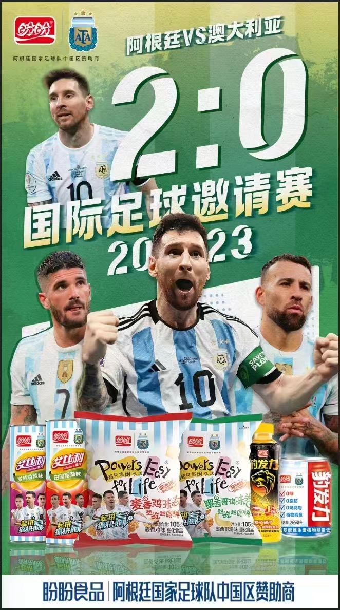 2:0!阿根廷赢了!6月15日晚,梅西带领阿根廷国家队在北京工人体育场举办的国际足球邀请赛上,对阵澳大利亚国家队。在比赛开场不到2分钟梅西便闪电进球,为阿根廷队取得梦幻开局,据阿根廷当地媒体报道,这个进球也是梅西职业生涯中的最快进球,下半场,梅西策动进攻,德保罗精准传中,佩泽拉头球破门,最终以2:0的成绩战胜澳大利亚男足国家队。值得一提的是,梅西此次比赛打满全场,梅西在属于他的足球赛场奋力拼搏,作为阿根廷国家足球队中国区唯一休闲零食及能量饮料赞助商,盼盼食品携旗下豹发力能量饮料助力梅西一战“豹”发,创造属于自己的辉煌!