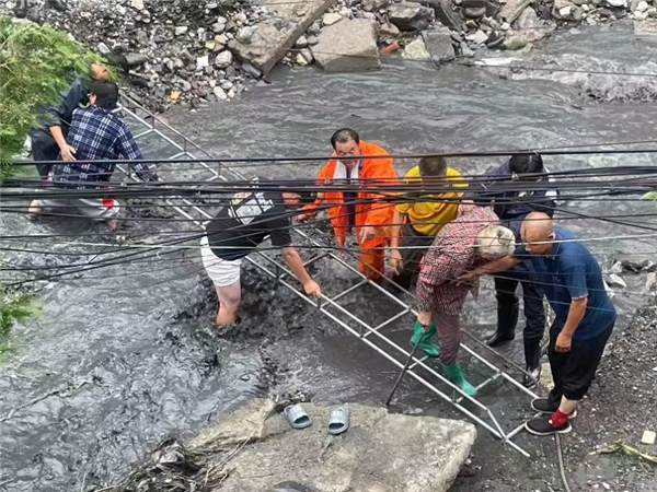 翻山不行,那就试试过河,只要到达了对岸,就能爬上北坡去四队了。志愿者任全江打起了彩虹门的主意,虽然已经过了知天命的年纪了,可他头脑灵活、动作敏捷,身体状况不输年轻人。横跨公路的彩虹门由不锈钢管焊接而成,主要功能是给景区做广告、悬挂宣传标语,而此时的公路却成了激流汹涌的河道。任全江找李会杨商量此事,两人一拍即合。彩虹门上方是双层拱形结构,其宽度刚好能容下人体。凌空于8米之高、匍匐于6米之宽的钢架上,直面于身下滔滔洪水,让人想起红军横渡铁索桥的场景,虽然无法与当年的惨烈相比,但他们毕竟是当今时代的勇士。