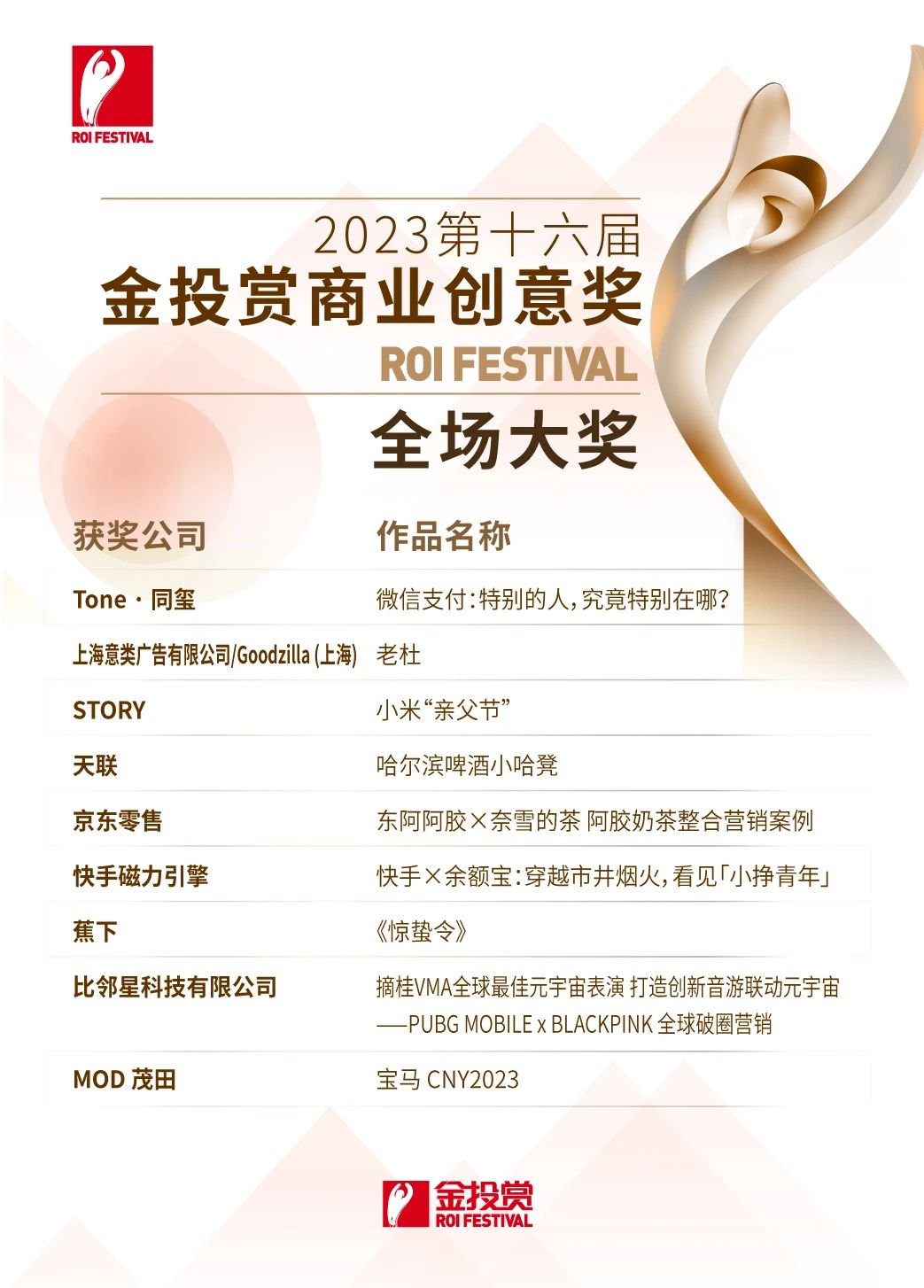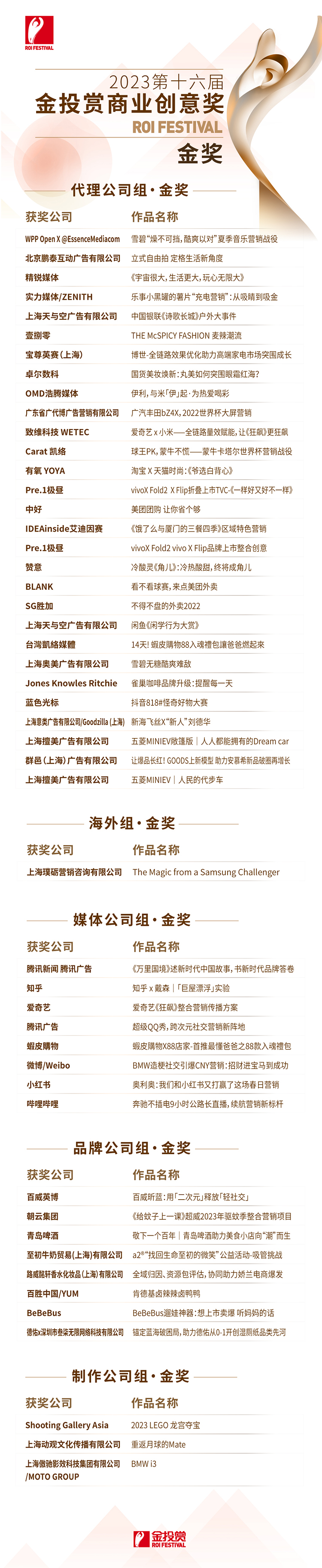 2023金投赏商业创意奖已经圆满落幕,我们可以发现在过去一年依旧有不少的优秀创意作品出街,推动商业创意发展。金投赏也期待明年将会有更多更精彩的创意作品参赛,引领行业高质量发展。