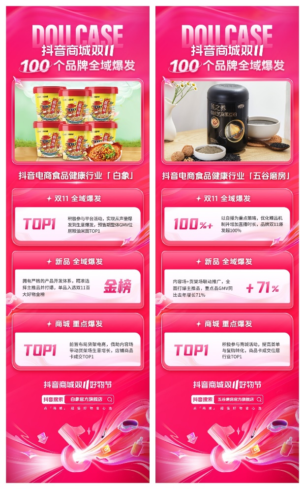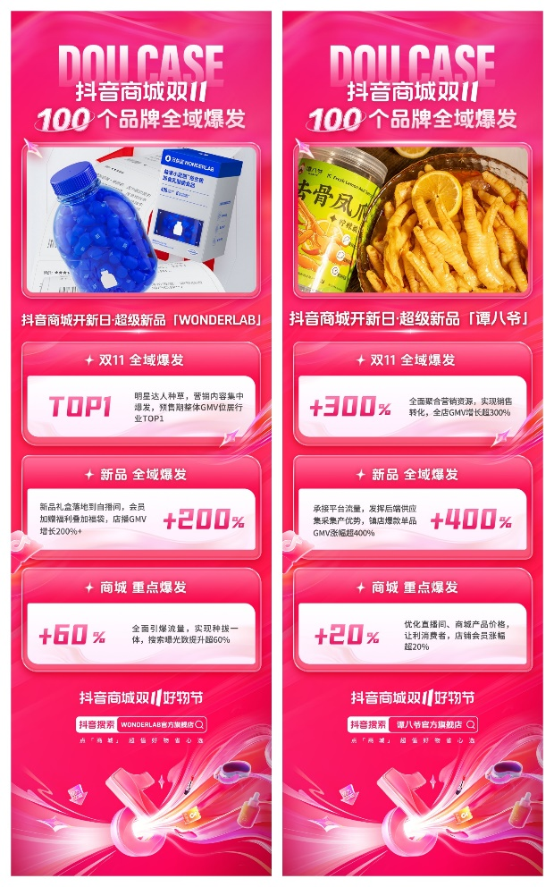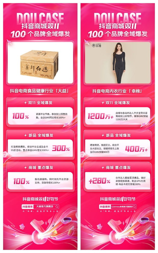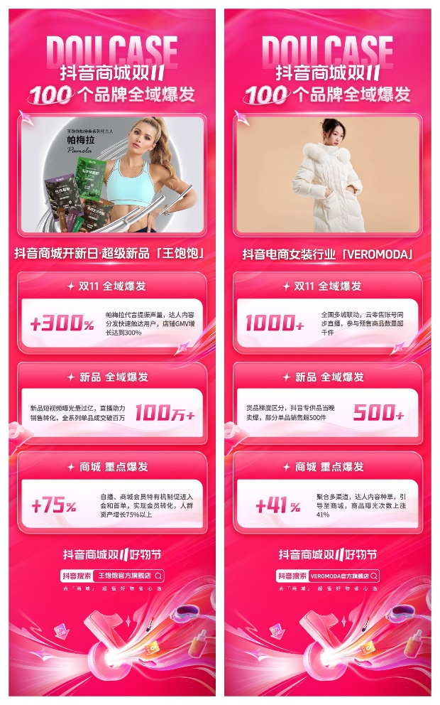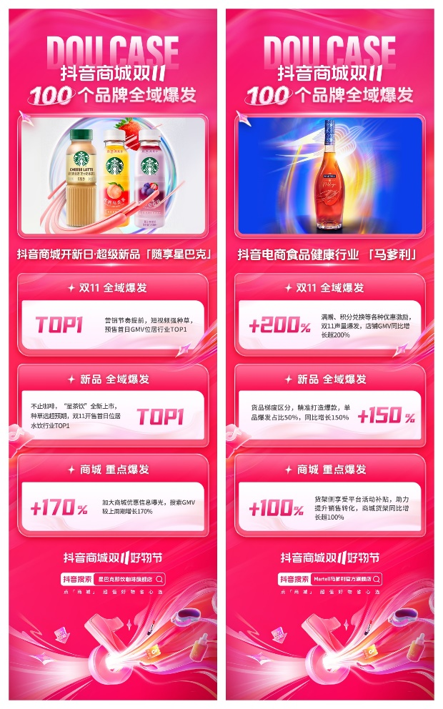 抖音电商案例营销IP「DOU CASE」,大促期间特别推出“抖音商城双11-100个品牌全域爆发”专题,本次发布的首轮案例约40余个品牌,来自不同行业、品类,各自在预售抢跑、品类爆款、货架增量、高效转化四大维度实现全域爆发,具体动作各有特色和亮点,值得更多品牌参考借鉴。
