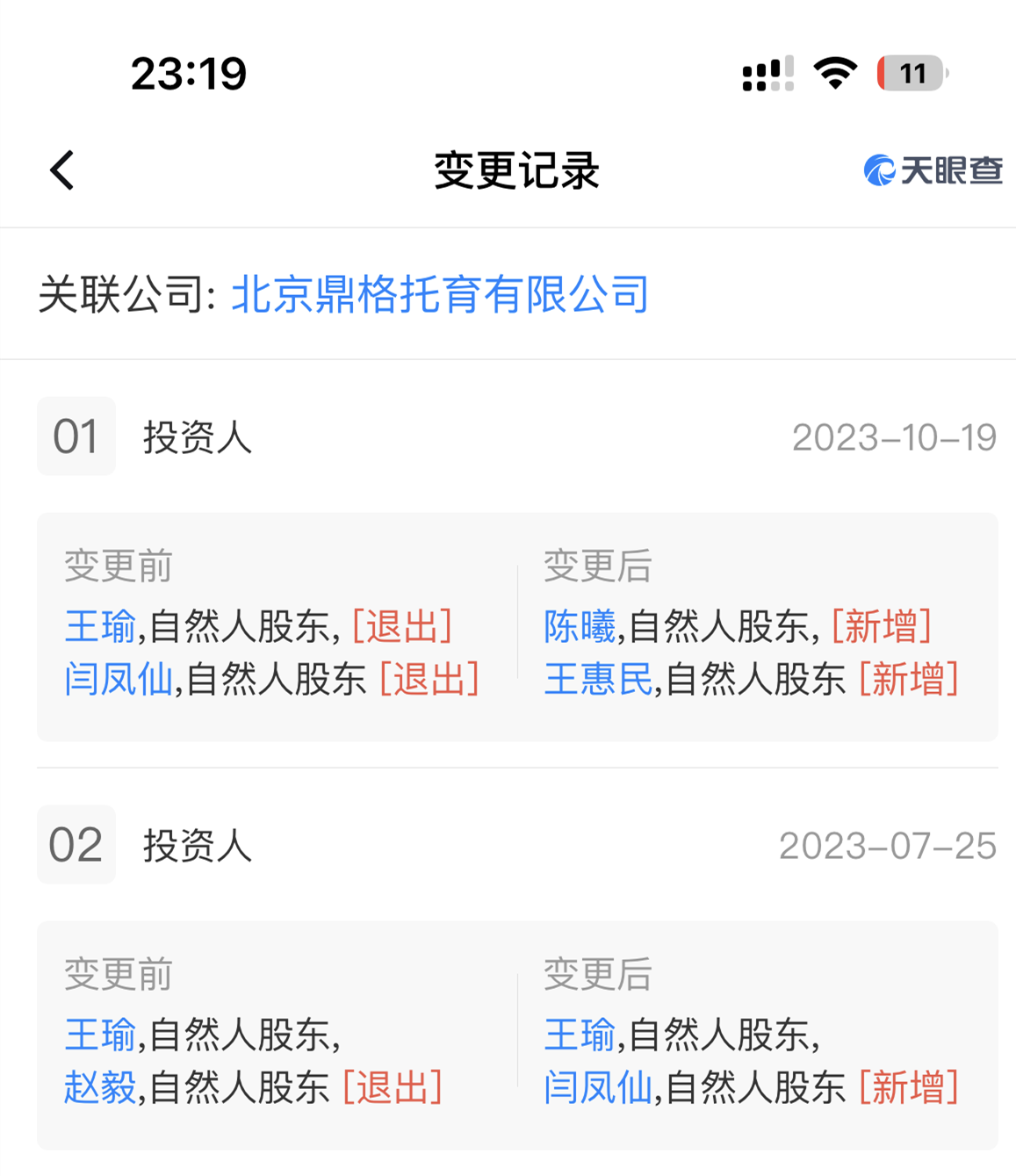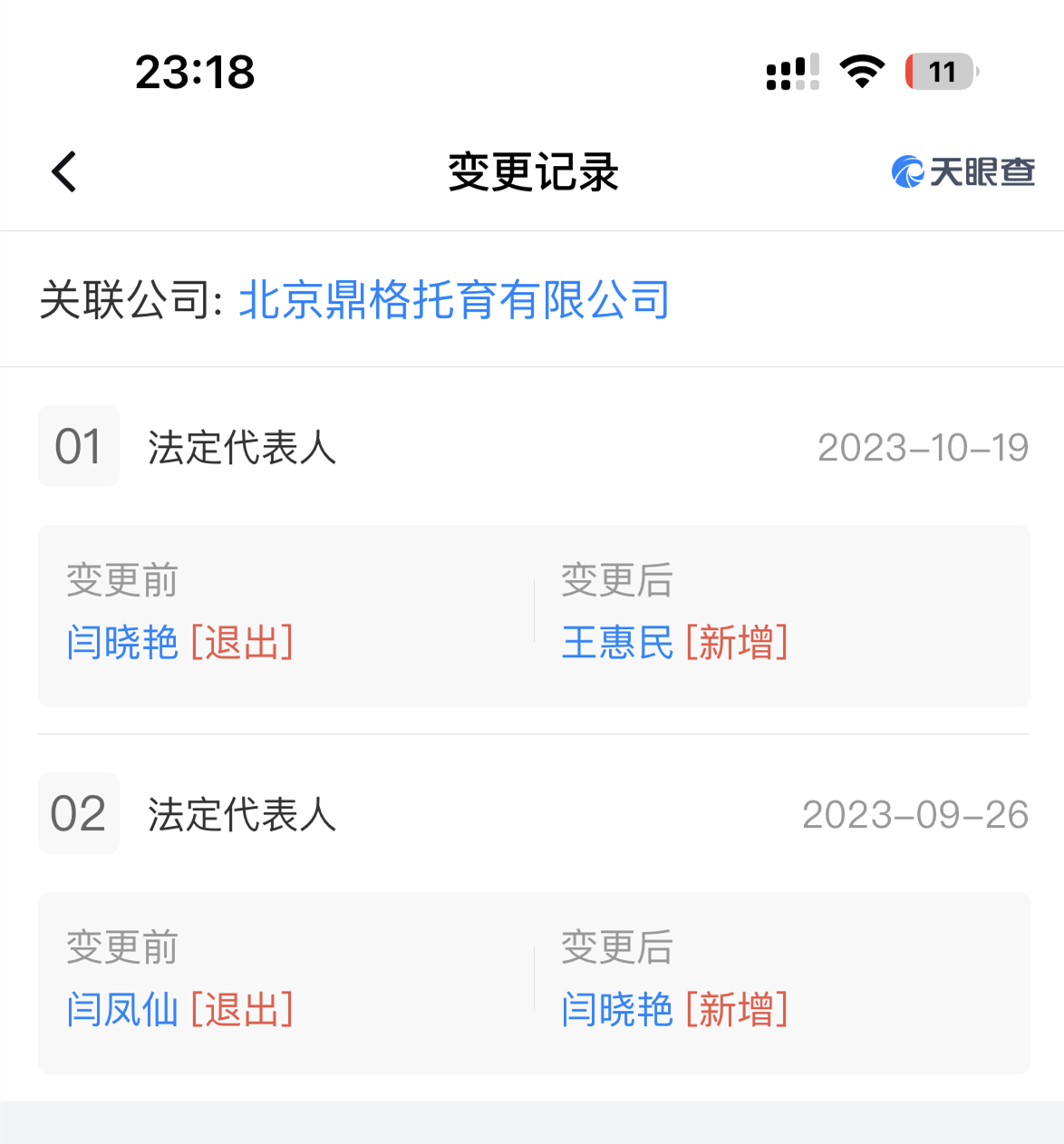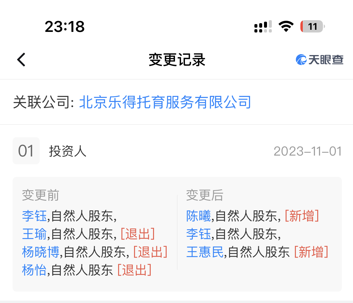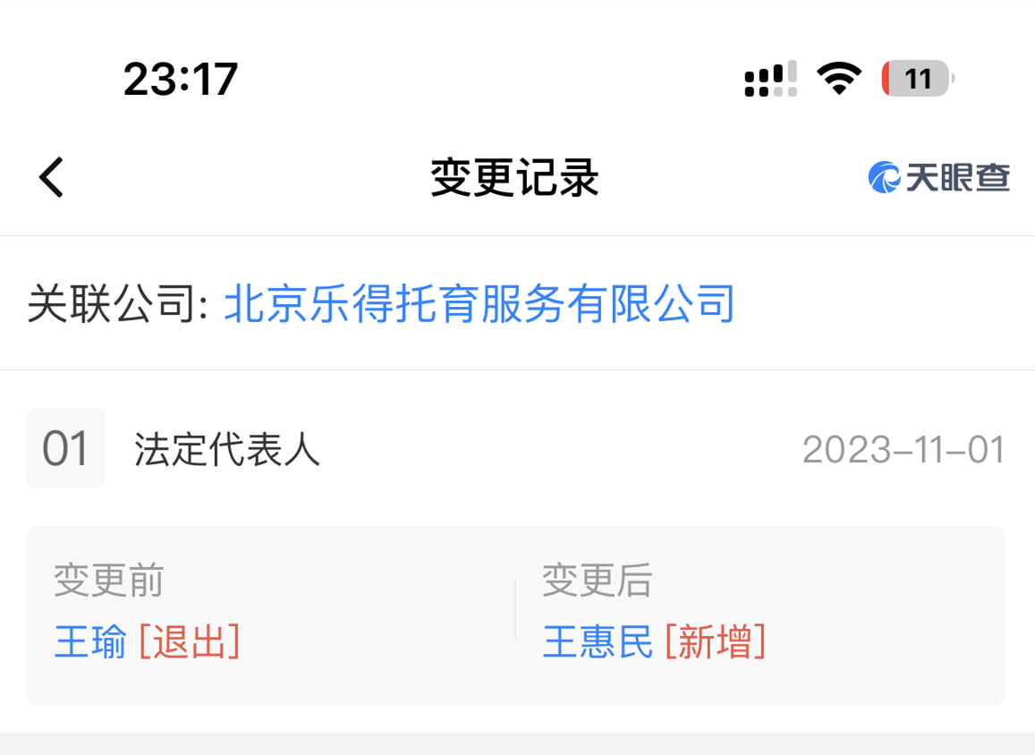 记者通过“天眼查”APP获悉,此次出现停课问题的北京鼎格托育有限公司(西红门校区经营主体)与北京乐得托育服务有限公司(上地校区经营主体)显示为共同法人与实际控制人,且分别都是在今年的10月、11月才完成人员变更。据校区相关人员透露,加盟机构变更法人是需要经过乐融儿童之家总部(北京乐融教育咨询有限公司)书面同意的。目前,西红门校区在人员变更仅2个月后,就因实际控制人陈曦无法提供后续资金保证校区运营,出现了停课问题。那在进行人员变更前,乐融儿童之家品牌方是否对变更人员持续经营校区的资质和能力进行评估?种种迹象表明,乐融儿童之家总部难辞其咎。