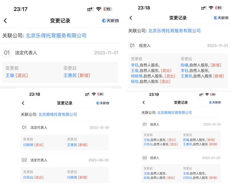 同时,通过“天眼查”APP获悉,此次出现关门停课问题的乐融儿童之家西红门校区,其经营主体北京鼎格托育有限公司与乐融儿童之家上地校区的经营主体北京乐得托育服务有限公司都分别在2023年10月、11月左右刚刚进行了人员变更。据校区相关人员透露,乐融加盟校区变更法人是需要征得乐融儿童之家总部北京乐融教育咨询有限公司的书面同意。而西红门校区在人员变更仅2个月后,就提出因实际控制人陈曦无法提供资金解决校区运营难题而关门停课,其上地校区也是类似原因关门。那么我们不禁要问,在进行人员变更前,乐融儿童之家总部是否同意,另外,有没有对“新变更的人员是否有持续经营校区的能力”进行评估?