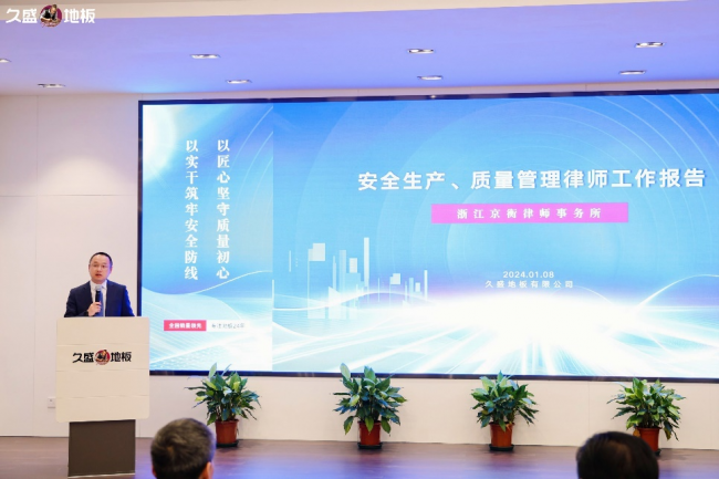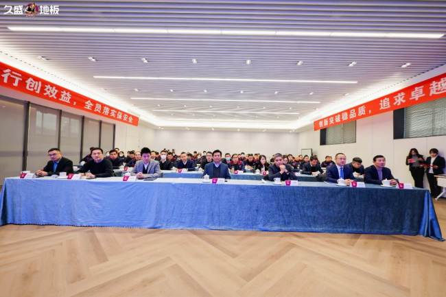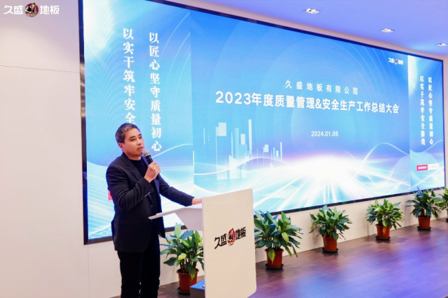 2024年1月8日,久盛地板2023年度质量管理&安全生产工作总结大会隆重召开。久盛地板有限公司董事长张凯、安全生产委员会主任张恩玖、质量管理委员会主任钱新民、安全生产委员会执行主任张东华、安全生产委员会专职副主任叶江、质量管理委员会副主任何雪洪、浙江京衡律师事务所吴东波律师团队、久盛各系统中心相关领导及生产系统班组长以上员工出席本次会议,共同回顾2023年度久盛地板在质量管理及安全生产工作中取得的成果和不足,部署2024年度的质量管理、安全生产工作计划和安排。