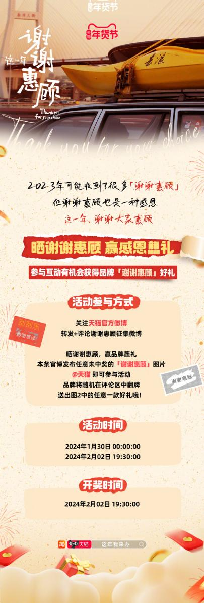 天猫并没有把这声“谢谢惠顾”停留在口头上,而是携手小米、卡萨帝、adidas、NIKE、林氏家居、乐高、MM豆、汰渍、vivo、金领冠、海尔、中信、FILA、博库、乐事等在视频中出镜的品牌,启动互动有奖活动。带话题#谢谢惠顾欢迎光临#发布谢谢惠顾图,即有机会赢得奖品丰厚的品牌大礼。
