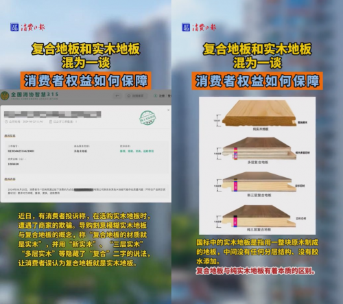 消费者默认的纯实木是由一整块木材制成的,一些不良商家却利用消费者对品类认知的不足,将复合地板宣传成纯实木地板推荐给消费者,不但价格虚高,且无视木复合地板因胶合结构隐藏甲醛释放的可能。
