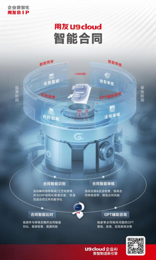 除此之外,U9 cloud还在积极探索在智能合同解析、智能成本分析、智能报价、智能销售预测等AI+应用场景上的创新,打造全流程、全链路的企业AI应用,全面提升制造企业的核心竞争力。比如,在智能合同方面,U9 cloud通过智能合同识别、对比、审核等,可帮助企业提高合同起草效率、降低合同风险等。