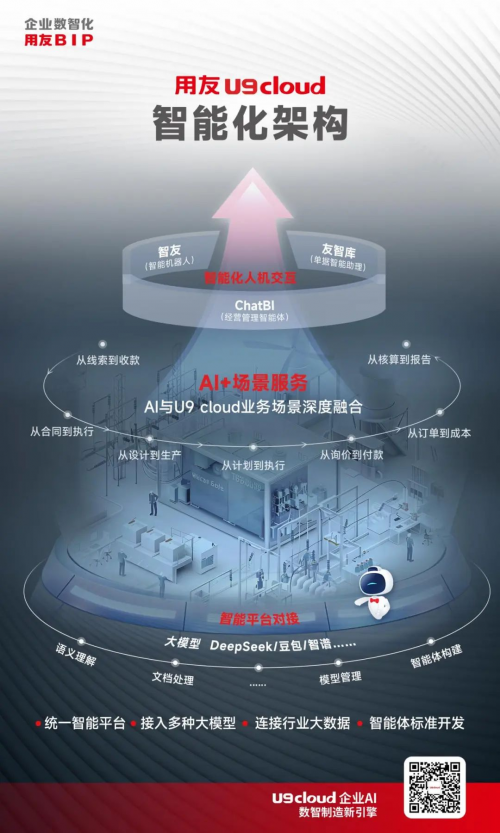 U9 cloud通过深度融合通用大模型与工业大模型,全面规划AI+场景应用,将AI融合到研发、生产、供应链等全链路场景中。
