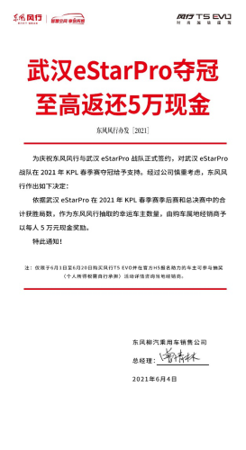 为了给武汉eStarPro战队带来最高分贝的场外声援,风行T5 EVO更携重磅好礼主动“上场”。据悉,风行T5 EVO将根据武汉eStarPro战队在KPL 2021春季赛中季后赛和总决赛的合计获胜局数,抽取相同数量的风行T5 EVO幸运车主,由购车属地经销商予以每人5万元现金奖励,携手Z世代铁粉为武汉eStarPro加油助阵。